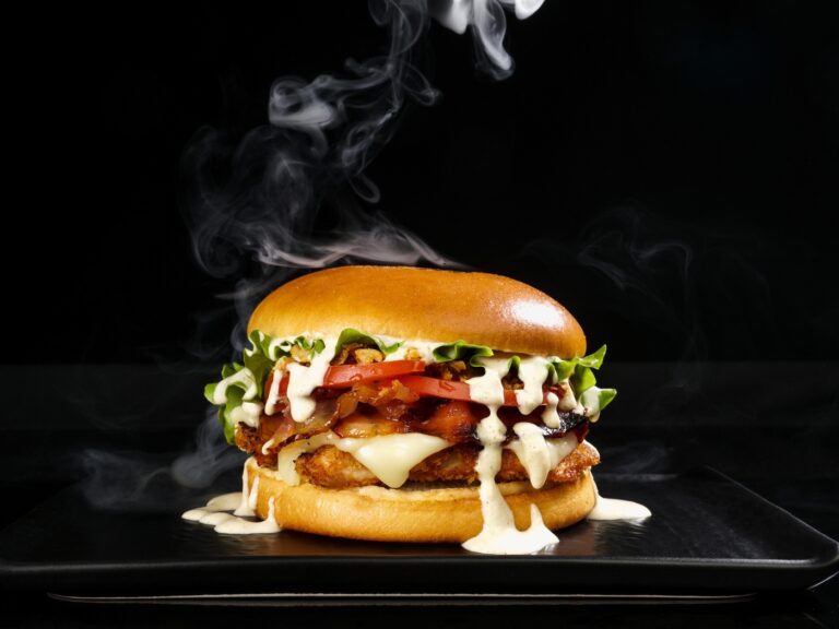 Состав: булочка, филе куриное, салат айсберг, помидор, бекон, сыр сливочный, Пармезан, лук жареный, соус цезарь