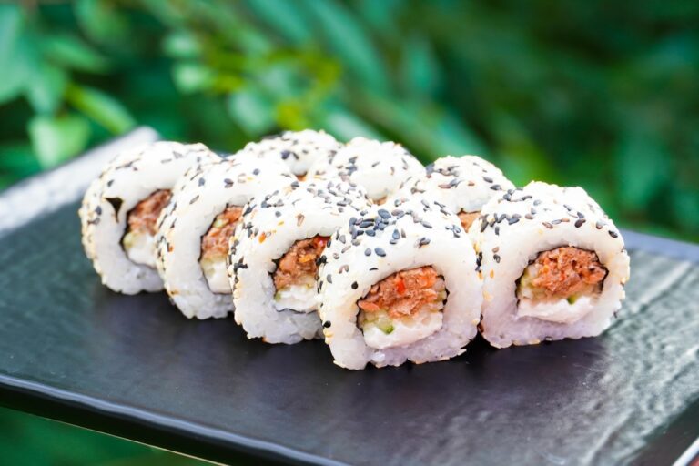 Состав: рис, нори, сыр сливочный, огурец, лосось терияки, кунжут