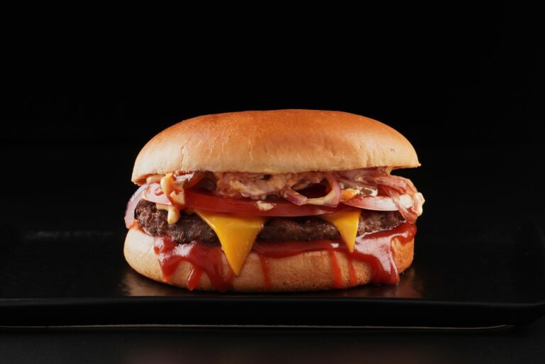 Состав: булочка, котлета из мраморной говядины, сыр Чеддер, помидор, лук, огурец, лук жареный, соус тейсти, кетчуп